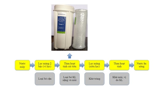 Bộ lọc dùng trong thí nghiệm gồm thiết bị màng vi lọc 2 bậc, sau đó đến thiết bị than hoạt tính cải tiến, màng siêu lọc và cuối cùng là than hoạt tính thông thường để khử mùi, vị (Hình 1).
